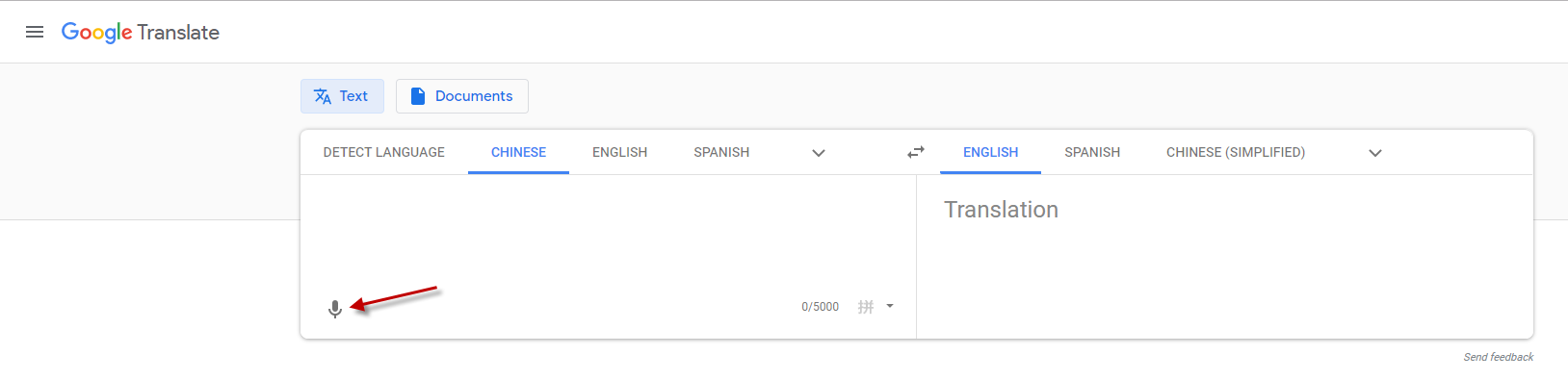 - Click on the microphone as shown in the image below to enable voice input. You may see a message pop up asking you to grant access to your microphone. Click allow.